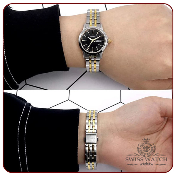 ساعت مچی زنانه سیتی زن مدل EQ0608-55E یکی از مدلهای کلاسیک و محبوب برند ژاپنی Citizen است که با طراحی ساده، استیل نقره ای و طلایی براق و صفحهی مشکی مینیمال، حس وقار و اعتماد بهنفس را در کنار ظرافت زنانه به نمایش میگذارد.