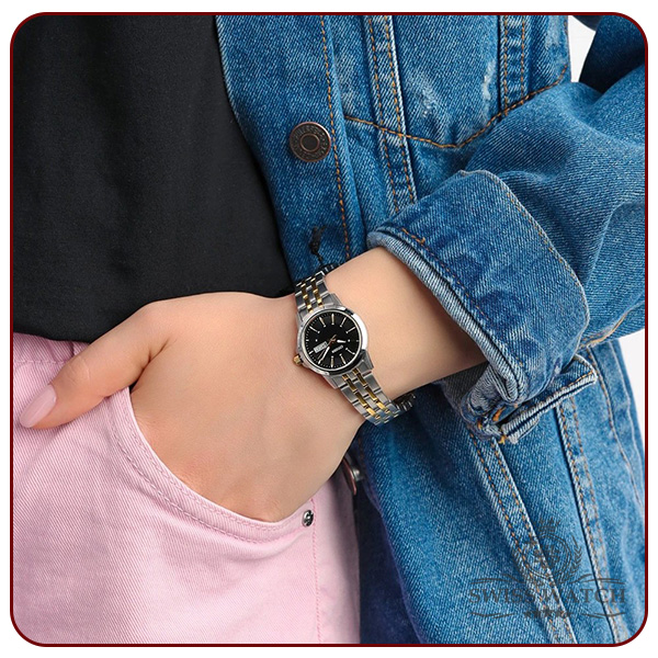 بدنه و بند فولاستیل نقرهای و طلایی با پرداخت براق، جلوهای درخشان و بادوام ایجاد کرده که در کنار صفحهی مشکی و عقربههای طلایی رنگ، ترکیبی زیبا و چشمنواز را شکل داده است. طراحی جمعوجور قاب، این مدل را به انتخابی مناسب برای مچهای ظریف و استایلهای رسمی یا روزمره تبدیل میکند.