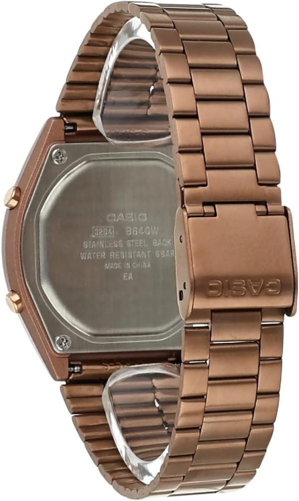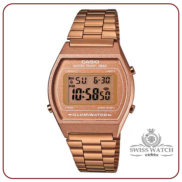 CASIO B640WC-5A یک ساعت دیجیتال زنانه با طراحی کلاسیک و مدرن از برند معتبر کاسیو است که با ترکیب رنگ رزگلد و نمایشگر دیجیتال، جلوهای شیک و جذاب دارد. این مدل به دلیل طراحی مینیمال و وزن سبک، برای استفاده روزمره، محیطهای کاری و موقعیتهای رسمی مناسب است.