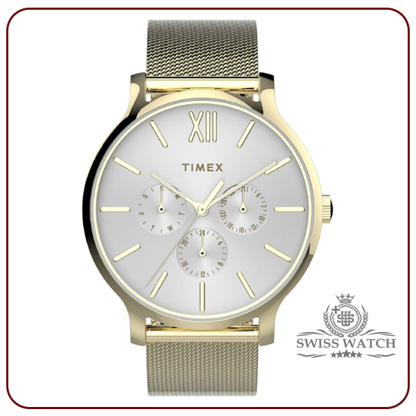 ساعت زنانه Timex WATERBURY یکی از مدلهای جذاب و خاص این برند آمریکایی است که با رنگ طلایی، بند استیل مش (Mesh) و صفحه سفید، جلوهای شیک و منحصربهفرد به استایل شما میبخشد. این ساعت با استفاده از موتور ژاپنی و مکانیزم کوارتز (Quartz)، دقت و عملکرد بینقصی را ارائه میدهد.