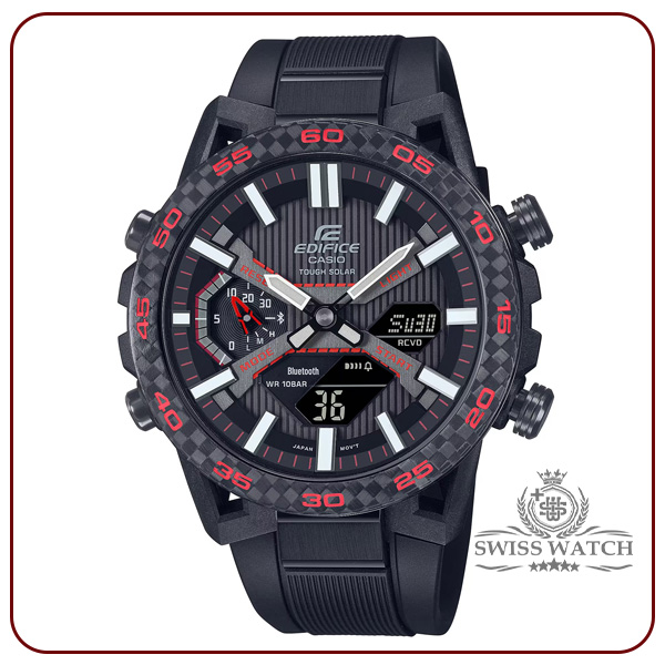 ساعت مچی مردانه کاسیو ادیفایس مدل ECB-2000PB-1ADF از سری محبوب EDIFICE، با صفحه مشکی و جزئیات قرمز و سفید و بند رابر مشکی، ترکیبی بینظیر از ظرافت، اسپرت بودن و فناوری پیشرفته ارائه میدهد. قاب ساخته شده از کربن و استیل ضدزنگ ضد حساسیت، مقاومت و کیفیت بالا را تضمین کرده و طراحی چندلایهی صفحه، جلوهای تکنولوژیک و حرفهای ایجاد کرده است.