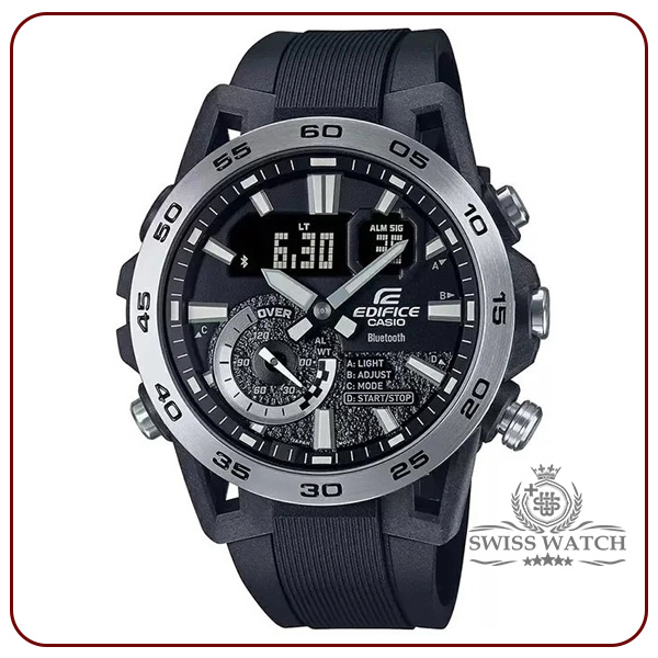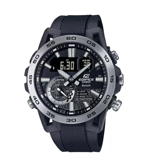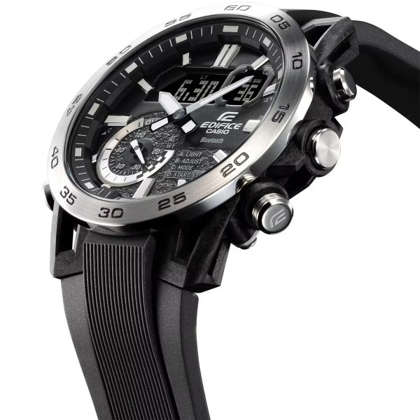ویژگی‌های اختصاصی ساعت کاسیو ادیفایس مدل ECB-40P-1ADF عالی برای مسابقات ماشین سواری | بلوتوث | زمان جهانی 38منطقه زمانی (38شهر + زمان جهانی هماهنگ) نمایش نام شهر / روشن/خاموش شدن تابستان / تعویض خودکار زمان تابستانی (DST) تعویض شهر خانه/زمان جهانی | کرونومتر 1/1000 ثانیه ظرفیت اندازه گیری: 00’00”000~59’59”999 (برای 60دقیقه اول) 1:00’00”0~23:59’59”9 (پس از 60دقیقه ) واحد اندازه‌گیری: 1/1000 ثانیه (برای 60دقیقه اول) 1/10 ثانیه (پس از 60 دقیقه) حالت‌های اندازه‌گیری: زمان سپری شده / زمان دور | تایمر شمارش معکوس واحد اندازه‌گیری: 1 ثانیه محدوده شمارش معکوس: 24​​ساعت محدوده تنظیم زمان شروع شمارش معکوس: 1 ثانیه تا 24 ساعت (افزایش 1 ثانیه، افزایش 1 دقیقه و افزایش 1 ساعته) | 5 آلارم روزانه | نور LED دوگانه برای صورت (نور LED خودکار، سوپر روشن‌کننده، مدت زمان روشنایی قابل انتخاب (1.5 ثانیه یا 3 ثانیه) پس‌تابش) نور پس‌زمینه LED برای نمایشگر دیجیتال (نور LED خودکار / سوپر روشن‌کننده / مدت زمان روشنایی قابل انتخاب (1.5 ثانیه یا 3 ثانیه) / پس درخشش) LED: سفید | تقویم خودکار کامل (تا سال 2099) | ویژگی تغییر دست (دست‌ها از مسیر خارج می‌شوند تا دیدی بدون مانع از محتویات نمایشگر دیجیتال ایجاد کنند.) | حالت پرواز | نمایش روز (روزهای هفته قابل انتخاب به شش زبان)