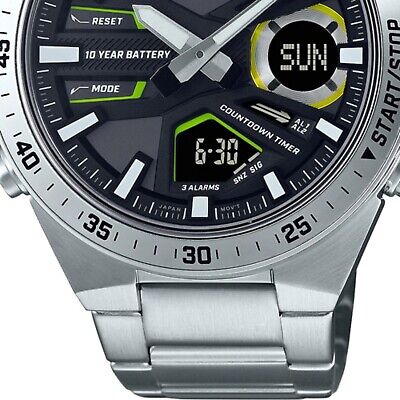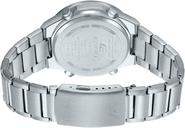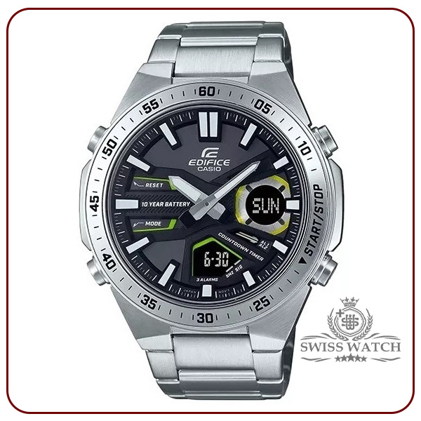 ویژگیهای اختصاصی ساعت کاسیو ادیفایس مدل EFV-C110D-1A3VDF زمان جهانی 29 منطقه زمانی (30 شهر) روشن/خاموش تابستان | کرنومتر 1/100 ثانیه ظرفیت اندازه گیری: 23:59’59.99 اینچ حالتهای اندازهگیری: زمان سپری شده / زمان تقسیم / زمانهای اول تا دوم | تایمر شمارش معکوس واحد اندازهگیری: 1 ثانیه محدوده شمارش معکوس: 24 ساعت محدوده تنظیم زمان شروع شمارش معکوس: 1 دقیقه تا 24 ساعت (افزایش 1 دقیقه و افزایش 1 ساعت) | 3 آلارم روزانه (با 1 زنگ هشدار) | تقویم خودکار کامل (تا سال 2099) | ظرفیت حافظه Telememo: حداکثر 30 مجموعه داده / با نام 8 کاراکتری و شماره تلفن 16 رقمی سایر موارد: صفحه نمایش حافظه باقی مانده / مرتبسازی خودکار | فرمت 12/24 ساعته | زمانسنجی منظم: آنالوگ: 2 عقربه (ساعت / دقیقه / حرکت عقربهها هر 20 ثانیه) دیجیتال: ساعت / دقیقه / ثانیه / صبح / بعد از ظهر / ماه / تاریخ / روز | تقریبا عمر باتری: 10 سال در CR2025