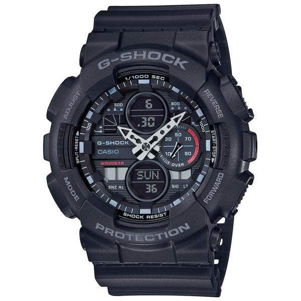 ویژگیهای اختصاصی ساعت کاسیو جی شاک مدل GA-140-1A1 مناسب ورزشهای سنگین | زمان جهانی 29 منطقه زمانی (48 شهر + ساعت جهانی هماهنگ)، روشن/خاموش تابستان، تعویض شهر خانه/زمان جهانی | کرنومتر 1/1000 ثانیه ظرفیت اندازهگیری: 99:59’59.999 اینچ حالتهای اندازهگیری: زمان سپری شده / زمان دور / زمان تقسیم سایر موارد: سرعت (0 تا 1998 واحد در ساعت) / ورودی فاصله (0.0 تا 99.9) نشانگر ماخ (سرعت) بیش از 1225 واحد در ساعت) | تایمر شمارش معکوس واحد اندازه گیری: 1 ثانیه محدوده شمارش معکوس: 24 ساعت محدوده تنظیم زمان شروع شمارش معکوس: 1 دقیقه تا 24 ساعت (افزایش 1 دقیقه و افزایش 1 ساعت) موارد دیگر: تکرار خودکار | 5 آلارم روزانه (با 1 زنگ چرت زدن) | سیگنال ساعت ساعتی | چراغ LED سوئیچ نور خودکار، مدت زمان روشنایی قابل انتخاب (1.5 ثانیه یا 3 ثانیه)، پس درخشش / LED: کهربایی | تقویم خودکار کامل (تا سال 2099) | فرمت 12/24 ساعته | زمانسنجی منظم: آنالوگ: 2 عقربه (ساعت / دقیقه (حرکت عقربه هر 20 ثانیه)) 1 شمارهگیری (سرعت) دیجیتال: ساعت / دقیقه / ثانیه / بعد از ظهر / ماه / تاریخ / روز | تقریبا عمر باتری: 2 سال در CR1220