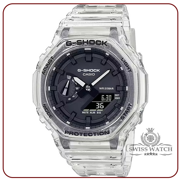 ویژگیهای اختصاصی ساعت کاسیو جی شاک مدل GA-2100SKE-7A باریک و راحت برای پوشیدن | زمان جهانی 31منطقه زمانی (48شهر + ساعت جهانی هماهنگ) / روشن/خاموش تابستان | کرونومتر 1/100 ثانیه ظرفیت اندازهگیری: 00’00”00~59’59”99 (برای 60دقیقه اول) 1:00’00~23:59’59 (بعد از 60دقیقه) واحد اندازهگیری: 1/100ثانیه (برای 60دقیقه اول) 1ثانیه (پس از 60دقیقه) حالتهای اندازهگیری: زمان سپری شده / زمان تقسیم / زمانهای رتبه اول تا دوم | 5 آلارم روزانه | تایمر شمارش معکوس واحد اندازهگیری: 1ثانیه محدوده شمارش معکوس: 24 ساعت محدوده تنظیم زمان شروع شمارش معکوس: 1ثانیه تا 24ساعت (افزایش 1ثانیه / افزایش 1دقیقه و افزایش 1ساعته) | نور LED دوتایی برای صورت (سوپر روشنایی / مدت زمان روشنایی قابل انتخاب (1.5ثانیه یا 3ثانیه)، نور پسزمینه LED برای صفحه نمایش دیجیتال (سوپر روشنایی / مدت زمان روشنایی قابل انتخاب (1.5 ثانیه یا 3 ثانیه) پسدرخشش) LED: سفید | تقویم خودکار کامل (تا سال 2099) | فرمت 12/24 ساعته | قابلیت تغییر عقربه (عقربهها از مسیر خارج میشوند تا دیدی بدون مانع از محتویات نمایشگر دیجیتال ارائه دهند.) | زمانسنجی منظم: آنالوگ: 2 عقربه (ساعت / دقیقه (هر 20 ثانیه حرکت عقربه)) 1 شمارهگیری (روز) دیجیتال: ساعت / دقیقه / ثانیه / بعدازظهر / ماه / تاریخ | تقریبا عمر باتری: 3 سال در SR726W X 2