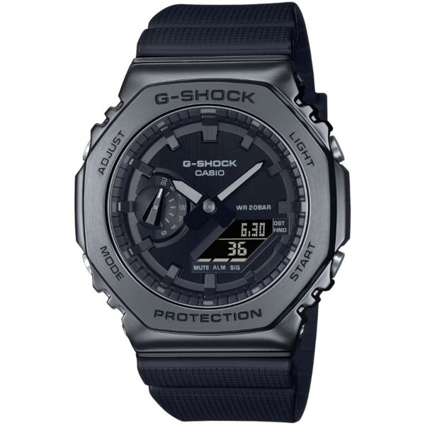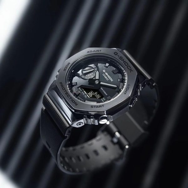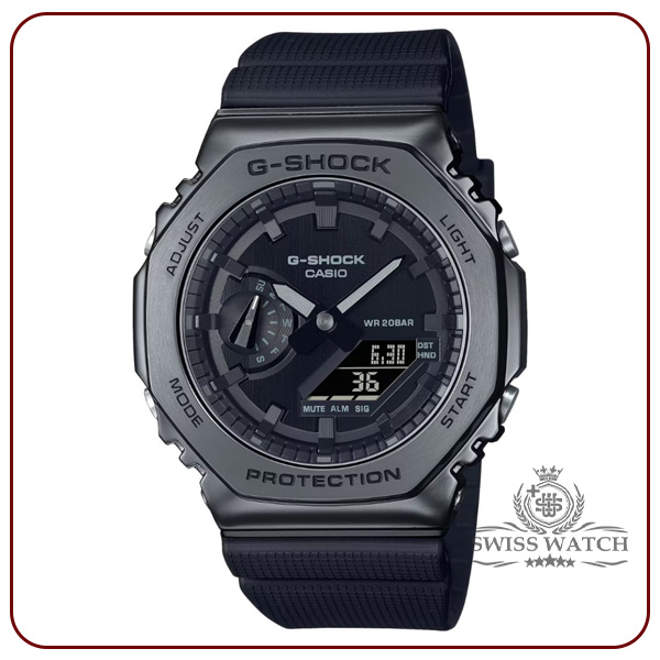 ویژگیهای اختصاصی ساعت کاسیو جی شاک مدل GM-2100BB-1ADR دارای آبکاری یونی | باریک و راحت برای پوشیدن | زمان جهانی 31منطقه زمانی (48شهر + زمان جهانی هماهنگ) / نمایش کد شهر / نمایش نام شهر / روشن/خاموش تابستان / تغییر ساعت خودکار تابستانی (DST) | کرونومتر 1/100ثانیه ظرفیت اندازهگیری: 00’00”00~59’59”99 (برای 60 دقیقه اول) 1:00’00~23:59’59 (بعد از 60 دقیقه) واحد اندازهگیری: 1/100ثانیه (برای 60 دقیقه اول) 1ثانیه (پس از 60دقیقه) حالتهای اندازهگیری: زمان سپری شده / زمان تقسیم | تایمر شمارش معکوس واحد اندازهگیری: 1 ثانیه محدوده شمارش معکوس: 24ساعت محدوده تنظیم زمان شروع شمارش معکوس: 1دقیقه تا 24ساعت (افزایش 1دقیقه و افزایش 1 ساعت) | 5 آلارم روزانه | سیگنال ساعت ساعتی | نور LED دوتایی برای صورت (سوپر روشنایی،/ مدت زمان روشنایی قابل انتخاب (1.5 ثانیه یا 3 ثانیه) / نور پسزمینه LED برای صفحه نمایش دیجیتال (سوپر روشنایی / مدت زمان روشنایی قابل انتخاب (1.5 ثانیه یا 3 ثانیه) پس درخشش) / LED: سفید | تقویم خودکار کامل (تا سال 2099) | فرمت 12/24 ساعته | قابلیت تغییر عقربه (عقربهها از مسیر خارج میشوند تا دیدی بدون مانع از محتویات نمایشگر دیجیتال ارائه دهند.) | زمانسنجی منظم: آنالوگ: 2 عقربه (ساعت / دقیقه (هر 20 ثانیه حرکت عقربه)) / 1 شمارهگیری (روز) دیجیتال: ساعت / دقیقه / ثانیه / بعدازظهر / ماه / تاریخ | تقریبا عمر باتری: 3 سال در SR726W X 2