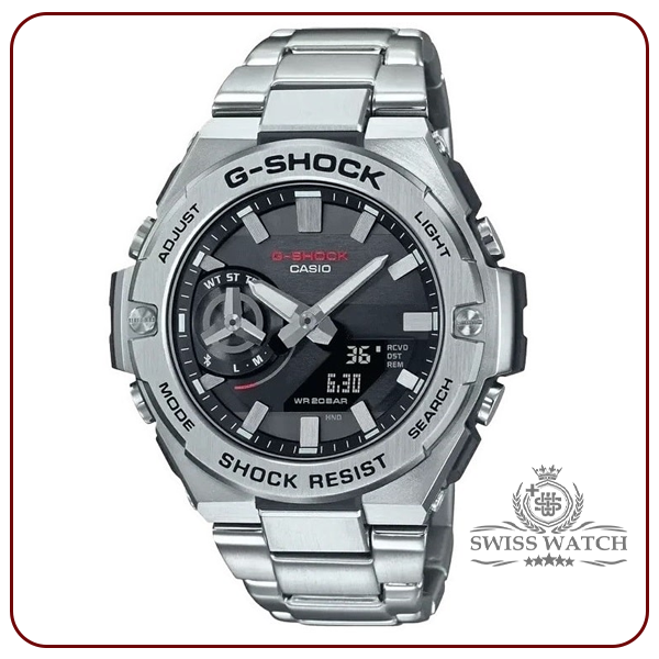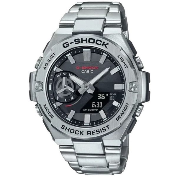 ویژگی‌های اختصاصی ساعت کاسیو جی شاک GST-B500D-1ADR | دارای نور پس‌زمینه به رنگ سفید | ۵آلارم روزانه زنگ اعلام هر ساعت | قابلیت اتصال از طریق بلوتوث به گوشی | شیشه معدنی (مینرال کریستال) ضد خش | مقاوم در برابر ضربه / ساختار محافظ هسته کربن | زمان جهانی 38 منطقه زمانی، تغییر خودکار زمان | ظرفیت باتری: 7 تا 18 ماه با قابلیت شارژ خورشیدی