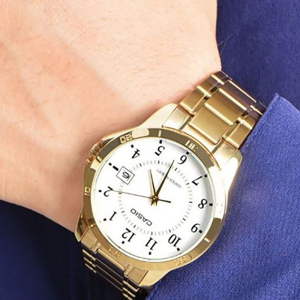 کاسیو MTP-V004G-7B با طراحی ظریف و رسمی، انتخابی عالی برای آقایانی است که به دنبال یک ساعت شیک، ساده و کارآمد هستند. قاب گرد استیل طلایی با قطر 41.5 میلیمتر و ضخامت 8.3 میلیمتر، ظاهری جذاب و در عین حال سبک و راحت دارد. صفحه سفید با عقربههای خوانا، ترکیبی هماهنگ را برای استفاده در محیطهای کاری، جلسات رسمی و استایلهای روزمره فراهم میکند.